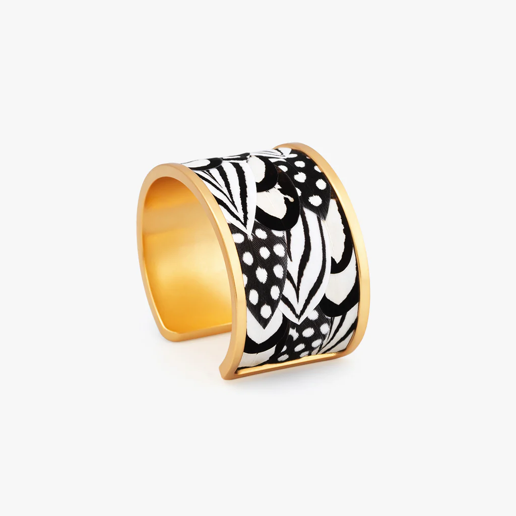 Abstract in design but classic in color, the black and white guinea and pheasant feather cuff is a must-have for your jewelry box - a timeless accessory that makes a chic statement with any outfit.