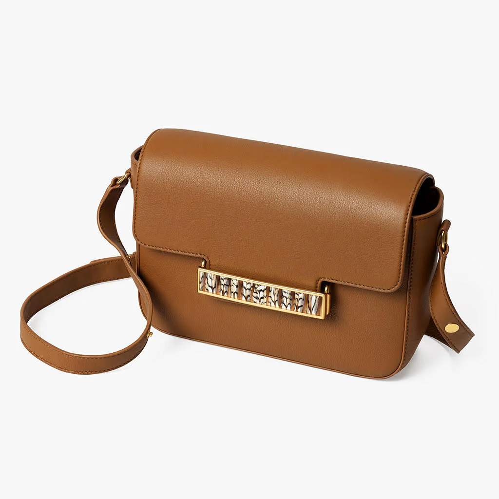 Inspired by the timeless sophistication of London, the Oxford Bar Handbag combines elegant design with practical functionality. Crafted from quail feathers, this bag exudes natural beauty, while the brown leather offers a rich, durable exterior that complements the earthy tones of the feathers.