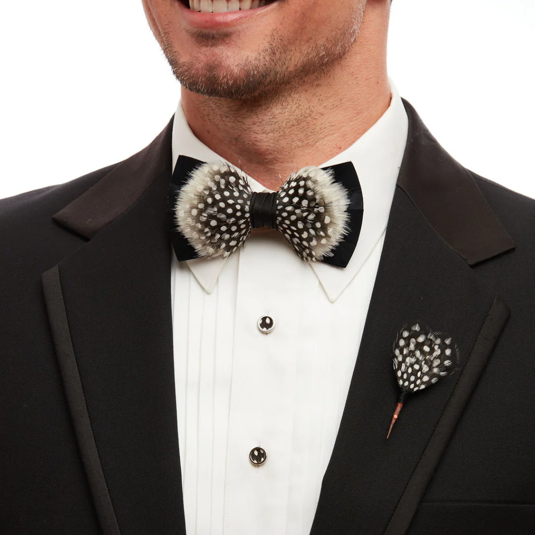 The Story | Thorns from wild plum thickets are foraged, dried, and paired with hand selected feathers by our team of artisans to create a one of a kind statement. Each Brackish Plum Thicket Pin is designed to naturally complement our unique line of bow ties, or stand out on its own. They can be worn as a lapel pin, brooch, or hat pin. Perfect combination with the Gatsby bow tie, as well the River Wind, North Wind, Guinea, St. Pierre, Durham and Edisto.